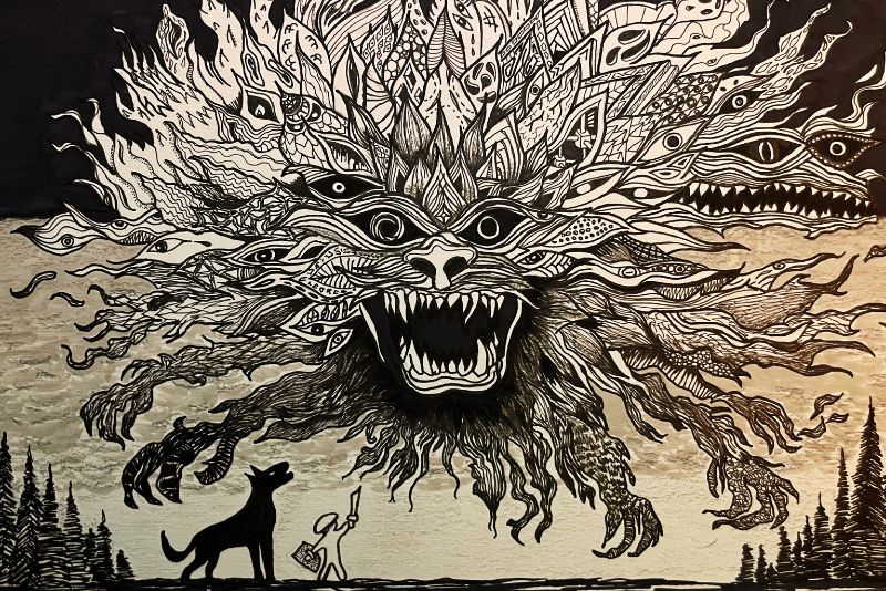 Rappresenta il compagno che ho avuto accanto per 14 anni e che era sempre presente durante i miei viaggi. Le esperienze psichedeliche non sono sempre rose e fiori anzi, spesso durante un viaggio ti trovi a dover affrontare esplorazioni introspettive intense, momenti di oscurità e perfino di paura... le mie esperienze non erano esenti da questa dinamica, ed ogni volta che la mia mente soccombeva alla paura cercavo con una mano di raggiungere Kirkon per accarezzarlo, abbracciarlo, il solo contatto con la sua pelliccia mi calmava e mi permetteva lentamente di uscire dal luogo oscuro in cui mi trovavo, la sua presenza gentile e discreta mi restituiva pace in quei momenti di chaos. Ed è cosi che ho deciso di metterlo in ogni tavola, in modo da dare all'osservatore un punto sicuro di ancoraggio qualora si sentisse perso nel disegno, cosi come era per me durante i viaggi. Un luogo sicuro.